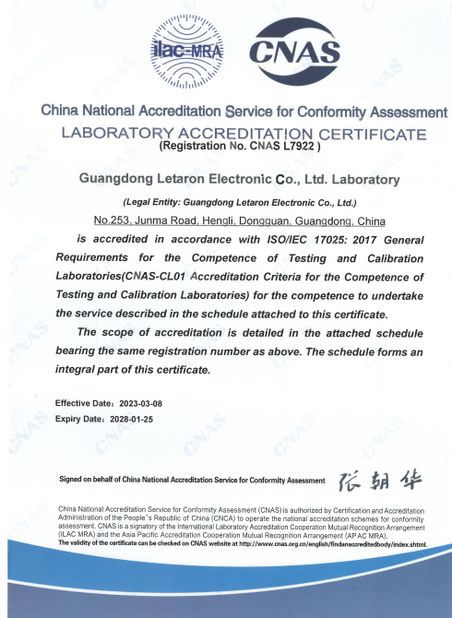 Letaron has built a quality technology research center, and established stable cooperative relations with authoritative certification bodies at home and abroad, which can provide one-stop testing and certification services for upstream and downstream enterprises, buyers, users, etc. In 2021, it was assessed as the National Quality Infrastructure (NQI) one-stop service platform by the Ministry of Industry and Information Technology.It has became a unique competitive advantage for Letaron.